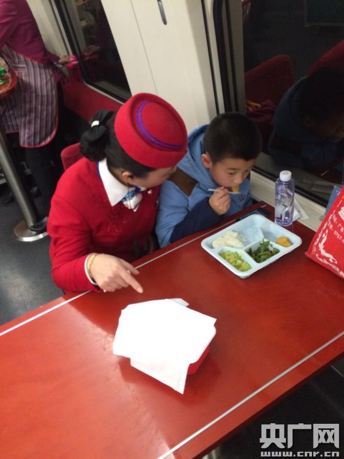 得知小男孩是獨自乘車之后,喻榮一邊安慰小男孩一邊呼叫列車長李婷趕來。此時列車在桂林站剛開車不就,已是晚上6點40分,李婷趕到后看到小男孩饑腸轆轆的樣子,既心酸又心疼。她和喻榮一起將小男孩和行李帶到餐車進行安置,同時將自己的乘務餐拿出來讓小孩先吃,看著小男孩狼吞虎咽的樣子,李婷的臉上浮現(xiàn)出了開心的笑容。吃過飯后,李婷和小男孩聊起了天,得知小男孩名叫姚熙程,父母都在桂林打工,姐姐在武漢上班,從小到大幾乎沒有出去旅過游。今年寒假來臨,爸爸特地將他送上了到武漢的高鐵,讓姐姐帶他見識下武漢的美麗風光,上車前在超市買了一份他喜歡吃的盒飯,沒成想一掀開米飯都發(fā)了霉,茫然無措的他這才找到乘務員尋求幫助。說到這里,小熙程的心情又低落了下來。