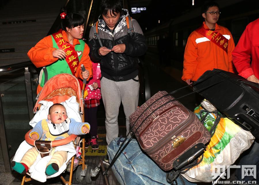 福州開往西南方向的列車是歷年春運的熱門車,回鄉(xiāng)的旅客多數(shù)是結(jié)伴而行,舉家遷移者為數(shù)不少,而且攜帶的行李大而笨重,黨團員志愿者服務(wù)隊的免費周到的服務(wù),給他們增添了溫暖。20時52分,福州開往達州K4382次列車滿載著1903名旅客正點開出,志愿者們在站臺上列隊揮手道別,他們就像燃燒著桔燈讓旅客們帶走溫暖和吉祥的祝福。