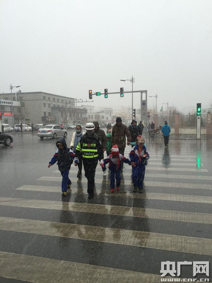 玉樹市紅旗小學(xué)學(xué)生放學(xué)后附近執(zhí)勤交警帶領(lǐng)學(xué)生過馬路(央廣網(wǎng)記者 葛修遠(yuǎn) 攝)