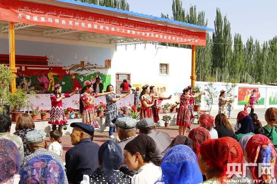 庫車縣齊滿鎮(zhèn)莫瑪鐵日克村民族團(tuán)結(jié)進(jìn)步文藝匯演(央廣網(wǎng)記者 張雷 攝)