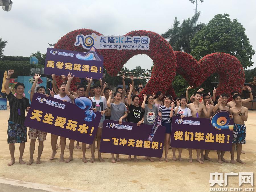當(dāng)天,一群身穿泳裝,手舉標(biāo)語牌的年輕人格外引人注目。記者了解到,這是一群來自廣州某高中剛結(jié)束高考的學(xué)生,此行目的就是希望以別具新意的形式來紀念人生中第一場大考。他們手舉寫有“我們畢業(yè)啦”、“天生愛玩水”、“一飛沖天放暑假”等字樣的標(biāo)語牌,青春活力在造浪池中盡情釋放。他們大聲吶喊,盡情舞動雙手拍打出細碎的水花,擺出各種可愛的造型,用最真誠的笑容致敬青春,拍下史上最“水”畢業(yè)集體照。