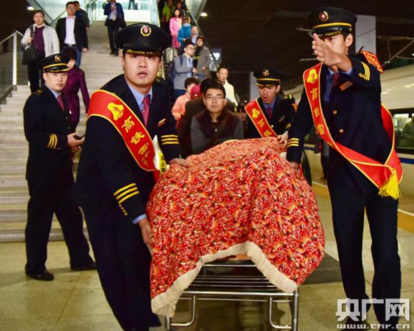 列車準(zhǔn)時(shí)進(jìn)站,王慶暉與列車長(zhǎng)辦理重點(diǎn)旅客交接,李彧將列車座椅盡量放置平躺,在空間有限的車廂連結(jié)處,三名雷鋒班成員同家屬一起將楊先生從擔(dān)架抬起,小心翼翼放至座椅。