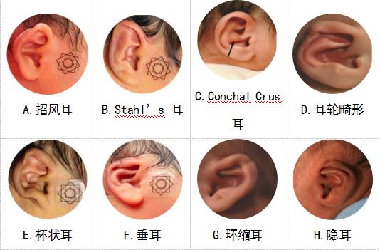 楊海弟副教授進(jìn)一步解釋說,新生兒耳廓形態(tài)畸形為胚胎期或生產(chǎn)時(shí)的外力因素所致,共有八大類型,分別為招風(fēng)耳、Stahl’s 耳、Conchal Crus 耳、耳輪畸形、杯狀耳、垂耳、環(huán)縮耳、隱耳。新生兒耳廓形態(tài)畸形常合并兩種或以上畸形,對(duì)其美觀性造成極大的影響。這些都是可以進(jìn)行矯正的類型。