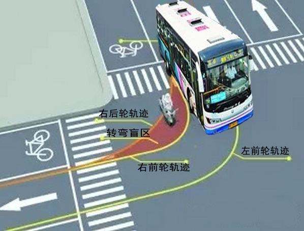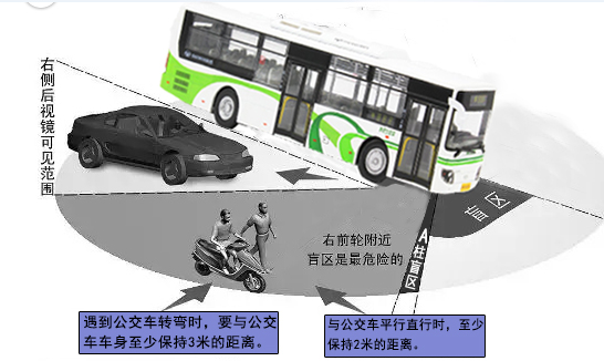 當公交車轉(zhuǎn)彎時,坐在左側(cè)駕駛位上的司機常常無法觀察到右前柱遮擋區(qū)域地面的狀況,拐彎時被右前柱覆蓋的位置都屬于危險區(qū)域,行人最好與車體保持2.5米—3米以上的距離。