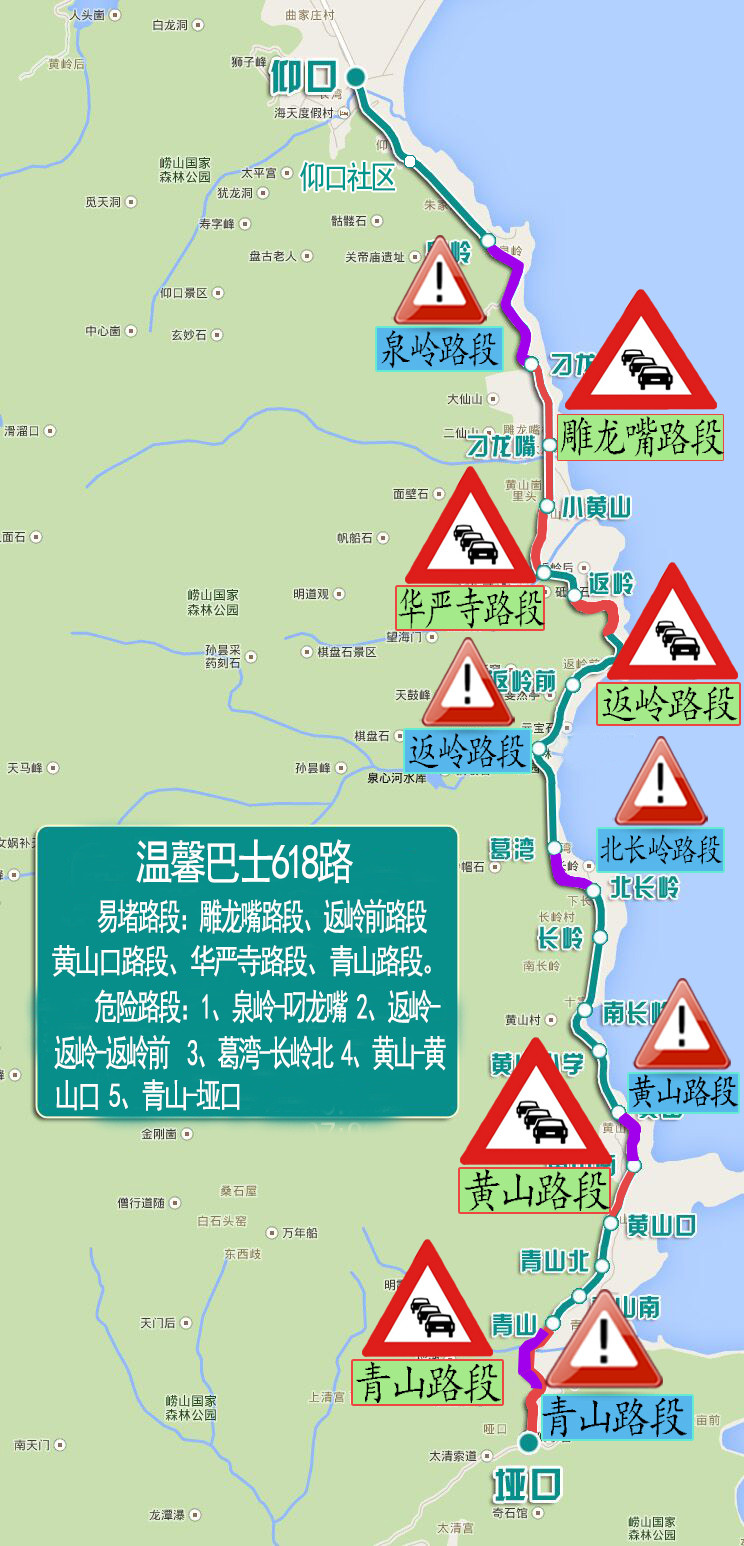 溫馨巴士639、618路公交車駕駛員結合旅游旺季工作經(jīng)驗,總結出嶗山景區(qū)的9處最危險路段 8個易堵路段。