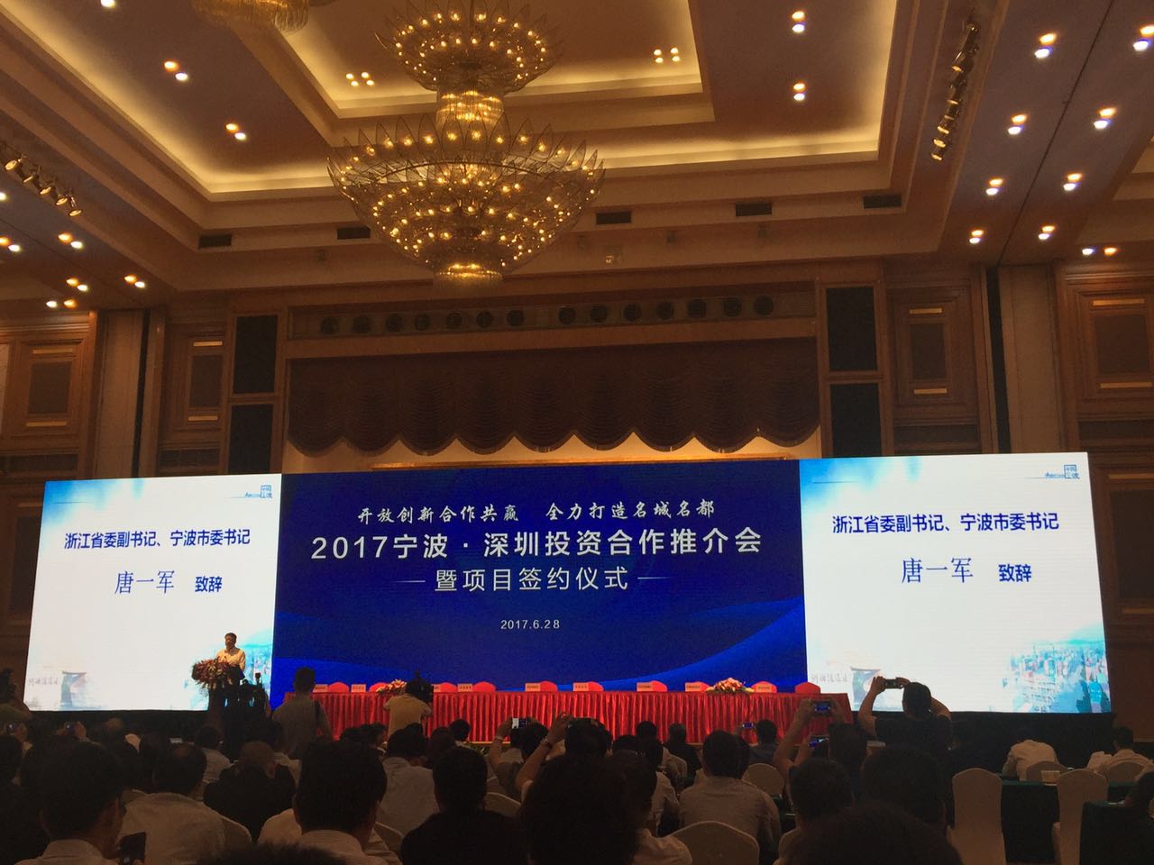 深圳市副市長陳彪、市委副秘書長林揚到會。浙江省委副書記、寧波市委書記唐一軍,寧波市委副書記、市長裘東耀、市人大常委會主任余紅藝、市政協(xié)主席楊戍標以及寧波市政府部門和區(qū)縣(市)負責人,企業(yè)代表約300余人參加了會議。