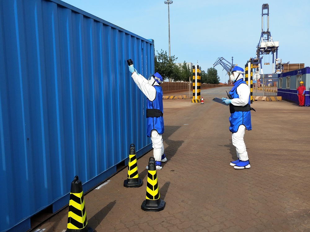 演練模擬在煙臺港某進(jìn)境集裝箱中發(fā)現(xiàn)非法夾帶放射性物質(zhì),經(jīng)現(xiàn)場排查,不能排除核與輻射有害因子涉恐事件為背景展開。