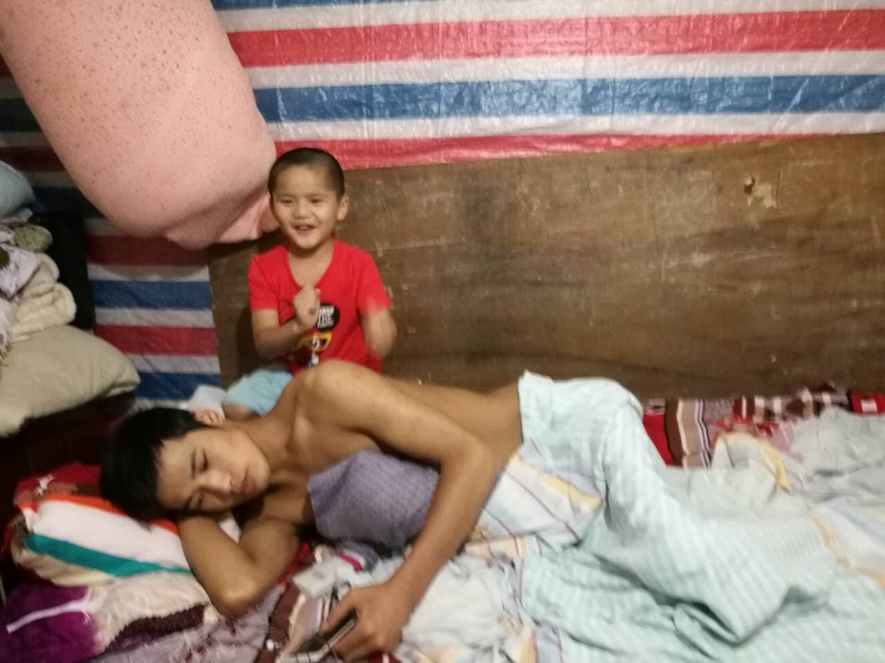掀開門口的布簾,10多平米的屋內(nèi)一覽無遺:兩張床,一張桌子,一臺(tái)電視機(jī)。呈直角擺放的兩張床,占了屋子的一半,床尾隨意堆放著衣服、箱子和棉被。28歲的劉東側(cè)躺在靠門的床上,一條薄被搭在下半身,隱約可見已經(jīng)蜷縮的雙腿。5歲的劉小羽在另一張床上玩耍,看見來人,沒有驚慌沒有躲閃。