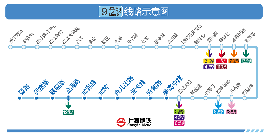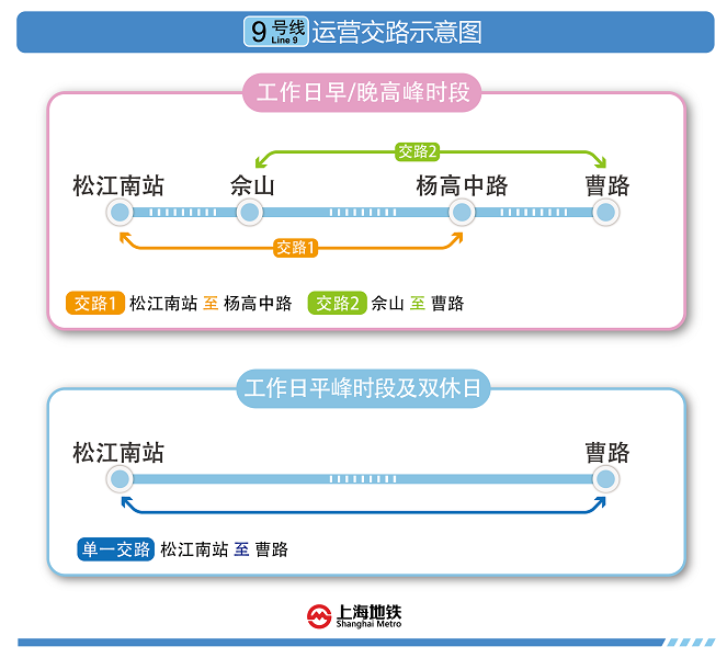 屆時(shí),工作日早晚高峰時(shí)段9號(hào)線列車開(kāi)行雙交路,兩個(gè)交路分別為:松江南站站——楊高中路站,佘山站——曹路站;工作日平峰時(shí)段及雙休日、節(jié)假日,9號(hào)線全線開(kāi)行單一交路,即:松江南站站——曹路站。