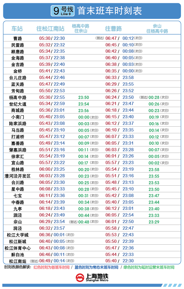 9號(hào)線三期楊高中路站——曹路站開(kāi)通試運(yùn)營(yíng)后,9號(hào)線常態(tài)全線運(yùn)營(yíng)時(shí)間5:30~0:14(次日),9號(hào)線采用多點(diǎn)首班車發(fā)車,曹路站及楊高中路站往松江南站方向的首班車時(shí)間均為5點(diǎn)30分,從而9號(hào)線既有區(qū)段松江南站站——楊高中路站沿途各站的首班車時(shí)間均保持不變。而由于線路的延長(zhǎng),常態(tài)末班車時(shí)間均有所延后。其中,松江南站站往浦東方向常態(tài)末班車時(shí)間由目前21:50延后至22:30;楊高中路站往浦西方向常態(tài)末班車時(shí)間由目前22:30延后至22:55,楊高中路站往曹路站方向末班車23:50,全線運(yùn)營(yíng)服務(wù)時(shí)間較開(kāi)通前延長(zhǎng)。