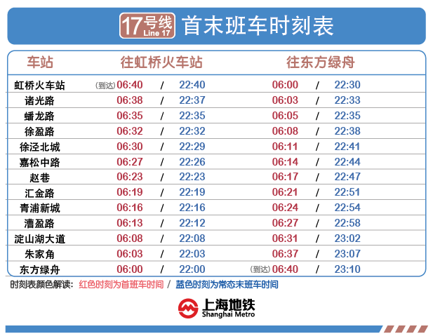17號(hào)線東方綠舟站——虹橋火車站站開(kāi)通試運(yùn)營(yíng)后,全線運(yùn)營(yíng)時(shí)間6:00~23:10。虹橋火車站站往東方綠舟站首班車6:00,末班車22:30;東方綠舟站往虹橋火車站站首班車為6:00,末班車為22:00。