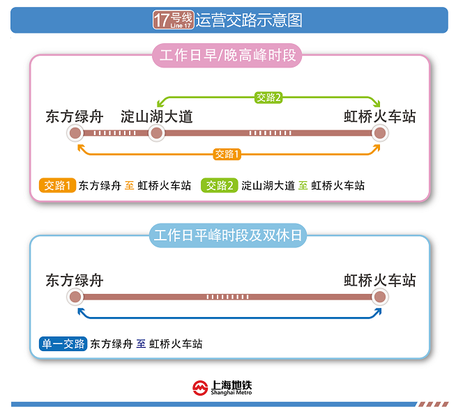 17號(hào)線虹橋火車站站——東方綠舟站開(kāi)通試運(yùn)營(yíng)后,工作日早晚高峰時(shí)開(kāi)行大小交路,其中大交路運(yùn)行區(qū)段:東方綠舟站——虹橋火車站站;小交路運(yùn)行區(qū)段:淀山湖大道站~虹橋火車站站。工作日平峰時(shí)段及雙休日、節(jié)假日,全線開(kāi)行單一交路,即:東方綠舟站~虹橋火車站站。