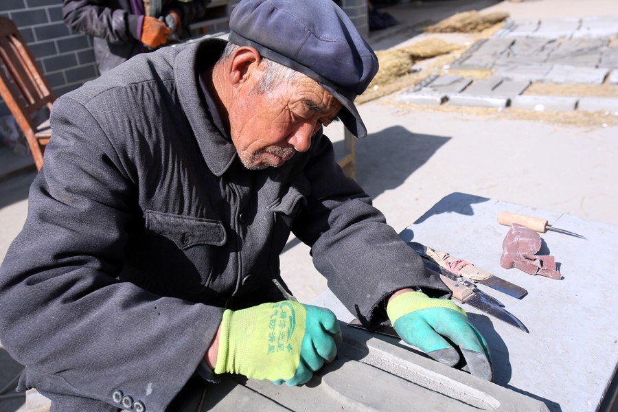 在磚雕加工場里,身穿一件老舊灰色中山裝的卜炳璽老漢正坐在冬日的陽光下,手里拿著鏨子細(xì)細(xì)打磨著一幅牡丹花圖案的磚雕作品。