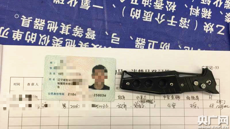 無獨有偶,24日上午9:50時許,一位中年男子過安檢時有意向右側(cè)身,一只手緊緊地貼在左邊的褲子口袋上,另一只手將手檢員的掃描儀推開。這一幕恰好被崗位民警發(fā)現(xiàn),經(jīng)檢查,結果查獲一把管制刀具。