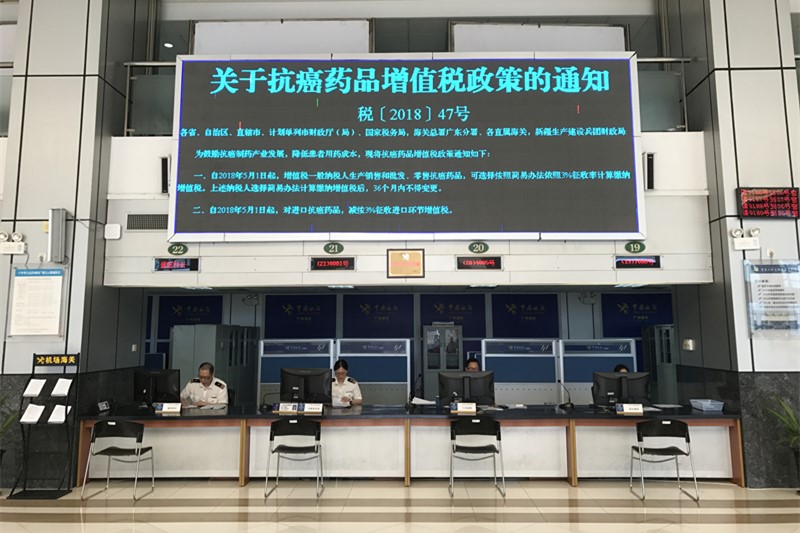 廣州白云機場海關(guān)報關(guān)大廳的電子公告屏上發(fā)布了關(guān)于抗癌藥品增值稅政策的通知(關(guān)悅攝)