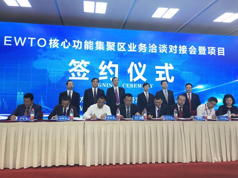 會上還舉行了EWTO核心功能集聚區(qū)業(yè)務洽談對接會暨項目簽約儀式,共有45個項目現場簽約,簽約金額230億元,業(yè)態(tài)涵蓋現代物流、電子商務、金融服務等多個領域。