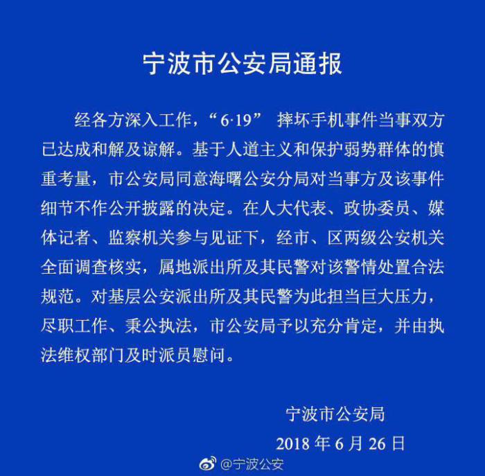 今天,寧波市公安局通過(guò)新浪官方微博回應(yīng)網(wǎng)友關(guān)注。警方稱:“6·19”摔壞手機(jī)事件當(dāng)事雙方已達(dá)成和解及諒解,出于人道主義,警方對(duì)當(dāng)事方及該事件細(xì)節(jié)不做公開披露。