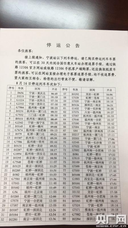 央廣網(wǎng)寧波8月16日消息(記者曹美麗 杜金明 通訊員徐峰 顏丙納)“溫比亞”正在向浙滬沿?拷,寧波火車站16日有112趟列車停運;疖囌咎嵝褟V大旅客:網(wǎng)上購買的聯(lián)程票與返程票如果和停運車子訂票的時候不是同一個單號,建議到車站窗口辦理退票,不收退票費。為了節(jié)省大家的排隊時間,如果是同一個單號的,建議自行網(wǎng)上辦理退票,不收退票費。