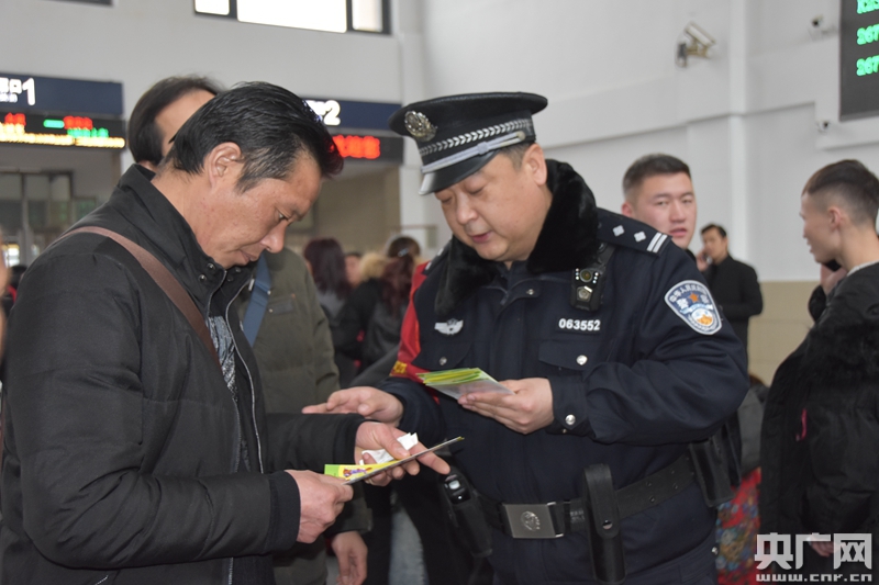 鐵路民警吉金宏在向旅客宣傳安全出行常識(shí)(央廣網(wǎng)發(fā) 運(yùn)城臺(tái)記者張強(qiáng) 攝)