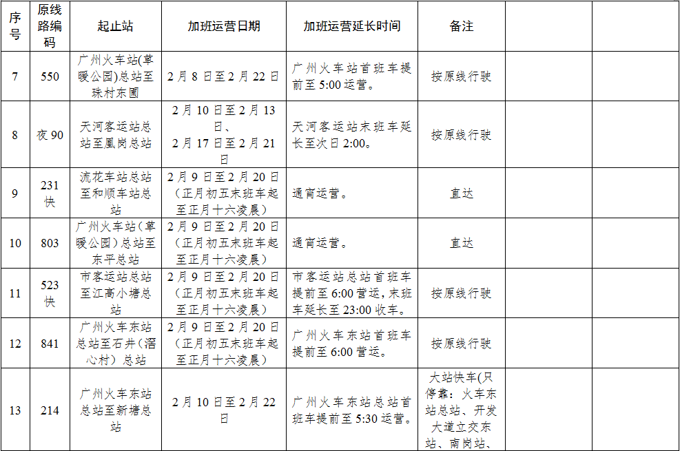 市交通部門還將優(yōu)化調(diào)整301A、夜62等7條線路的發(fā)班時間,加強春運期間廣州南站及嘉禾望崗地鐵站周邊公交接駁服務工作,同時延長廣州南站現(xiàn)有公共汽車夜20、夜61、夜79、夜102等4條線路服務時間至高鐵末班車抵達20分鐘后,確保深夜抵達旅客的順利出行。