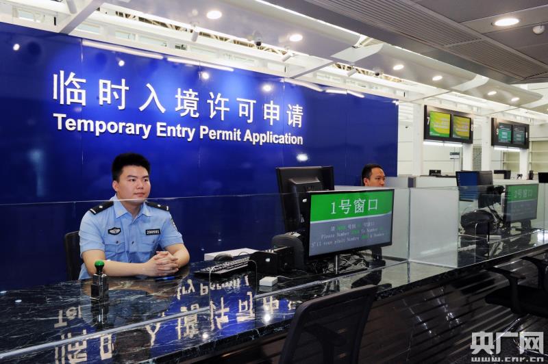 邊檢工作人員模擬入境免簽流程。(央廣網(wǎng)發(fā) 陳庭輝 攝)