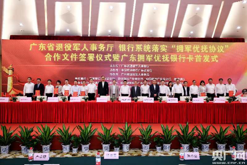 央廣網(wǎng)廣州5月14日消息(記者郭翔宇 通訊員葉婷婷)今天上午,廣東省退役軍人事務(wù)廳在廣州舉辦“廣東省退役軍人事務(wù)廳 銀行系統(tǒng)落實‘擁軍優(yōu)撫協(xié)議’合作文件簽署儀式暨廣東擁軍優(yōu)撫銀行卡首發(fā)式”。工商銀行廣東省分行、農(nóng)業(yè)銀行廣東省分行、中國銀行廣東省分行、建設(shè)銀行廣東省分行等11家銀行相關(guān)負責(zé)人,烈軍屬代表、現(xiàn)役軍人代表、退役軍人代表等約200人出席了儀式。