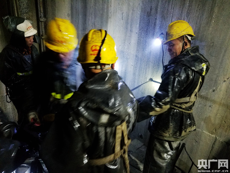記者在現(xiàn)場看到,工人們每次下井施工,都要乘坐吊桶,面積不到5平方米,乘坐不能超過5人,而且上下其間沒有燈光照明。從井口到井底,需要四五分鐘的時間,豎井內(nèi)施工區(qū)面積不足30平方米,每個工人相當于在一個普通的餐桌上作業(yè)。因涌水不斷,工人們的防水服幾乎起不到作用,近乎泡在水里,一個班要堅持8個小時。