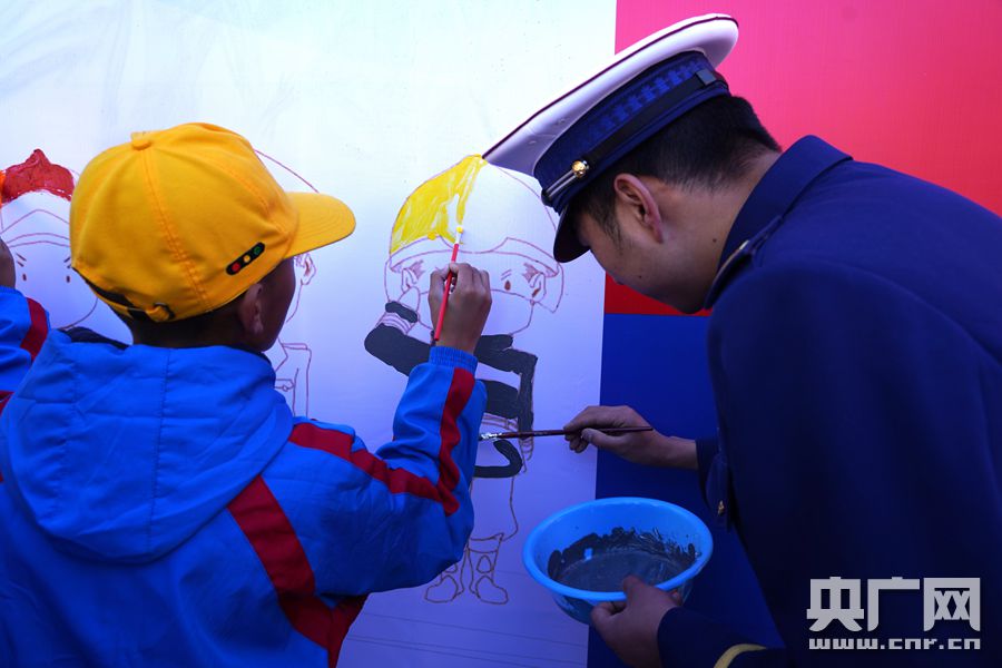 消防員和小學(xué)生一起互動涂鴉(央廣網(wǎng)見習(xí)記者 卜鵬 攝)
