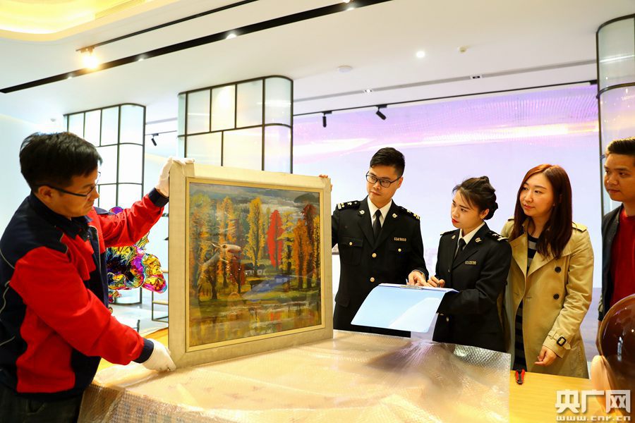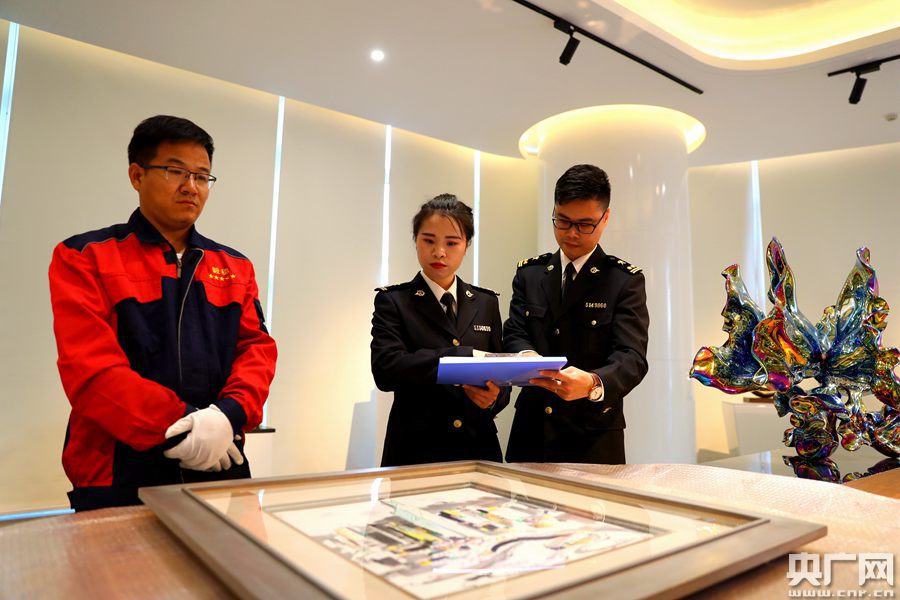 廣州海關(guān)所屬南沙海關(guān)關(guān)員現(xiàn)場(chǎng)監(jiān)管參展藝術(shù)品(央廣網(wǎng)發(fā) 殷壽柏?cái)z)