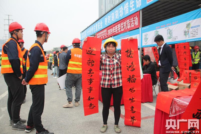 工人師傅高興地領(lǐng)到春聯(lián)(央廣網(wǎng)發(fā) 照片由中建五局廣西公司提供)