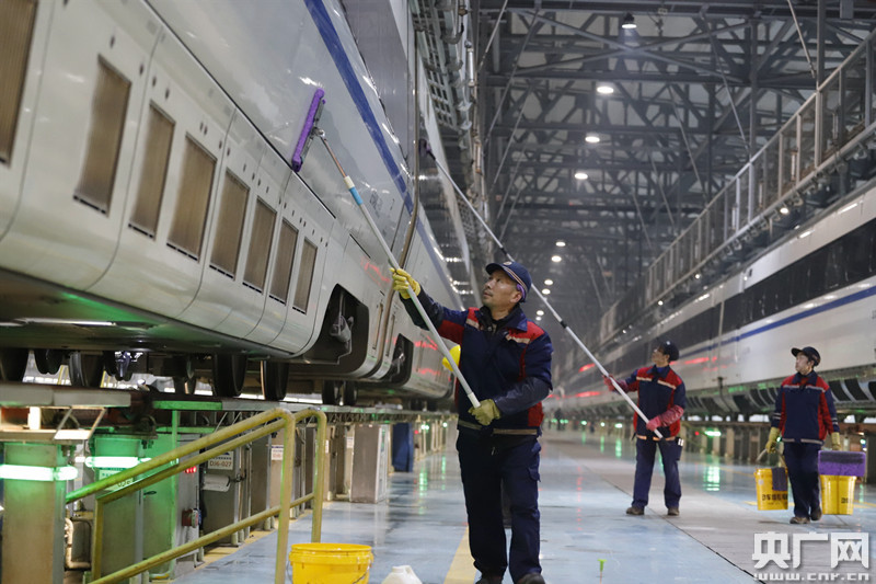 成都動車段檢修庫內(nèi),工人師傅在給動車外皮做保潔(央廣網(wǎng)發(fā) 通訊員周兵 攝)