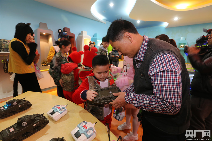 1月22日,一位出租車師傅陪兒子操作玩具坦克。(央廣網(wǎng)記者 魏煒 攝)