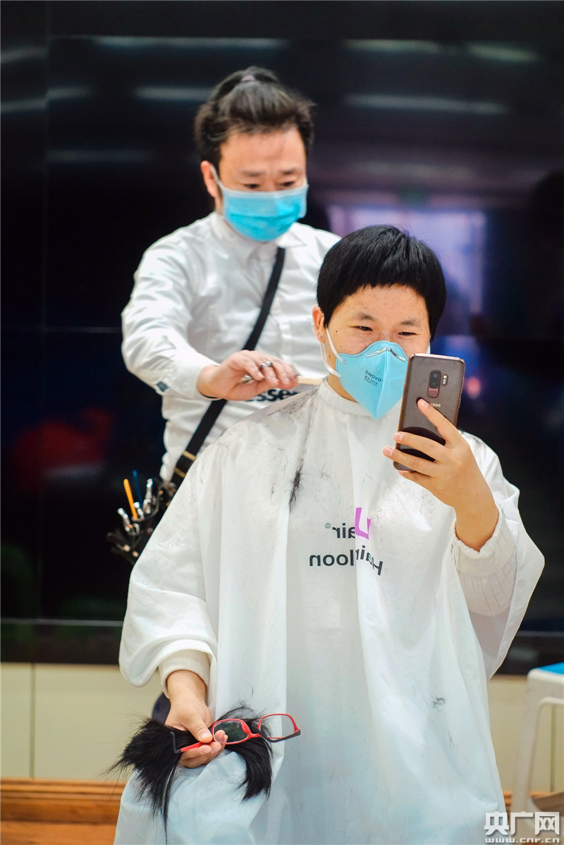 王季華一手攥著被剪下來的長發(fā),一手拿著手機(jī)看發(fā)型(央廣記者 柴安東 攝)
