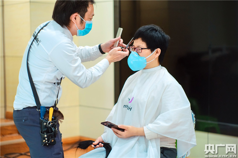 理發(fā)師為隊(duì)員們修剪頭發(fā)(央廣網(wǎng)發(fā) 裴濤供圖)