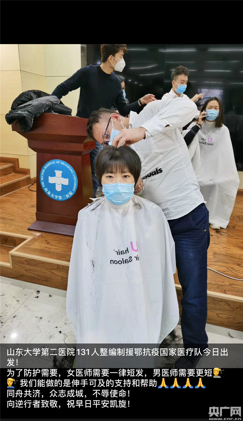 央廣網(wǎng)濟(jì)南2月9日消息(記者劉華棟 柴安東 唐磊)2月9日上午8點(diǎn)左右,山東大學(xué)第二醫(yī)院小廣場上一片繁忙。昨天,醫(yī)院接到緊急通知,需要組織131名醫(yī)護(hù)人員支援湖北戰(zhàn)“疫”前線,此時(shí),報(bào)名“參戰(zhàn)”的醫(yī)護(hù)人員和他們的同事、家屬正在緊張有序地整理打包。廣場南邊的小禮堂里,一角空地臨時(shí)當(dāng)成了“美發(fā)廳”,不少即將出征的醫(yī)護(hù)人員正坐在塑料凳上剪發(fā),看到新進(jìn)來的人,理發(fā)師會邊忙邊問:“您需要剪發(fā)嗎?”并順口說:“免費(fèi)。”