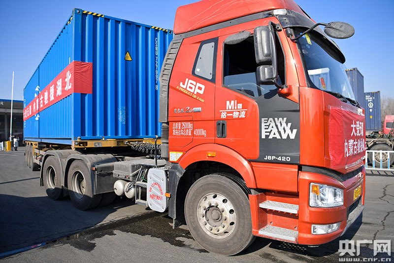 內(nèi)蒙古支援湖北600噸乳肉生活必需品今日啟運(yùn)(央廣網(wǎng)記者 鄭穎 攝)