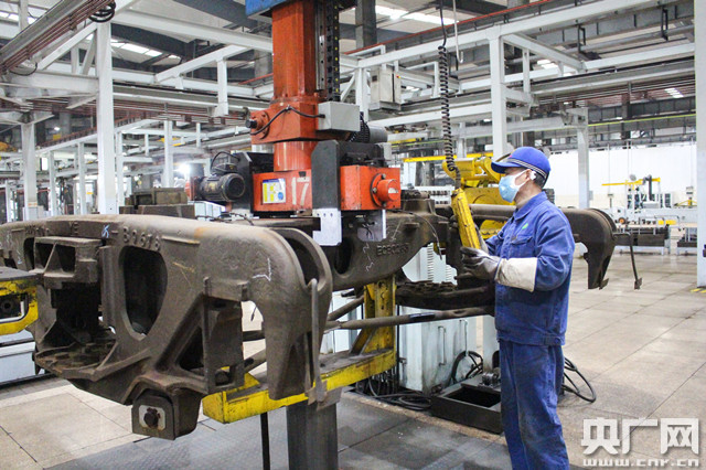 轉(zhuǎn)向架線上班職工姜長(zhǎng)貴對(duì)翻轉(zhuǎn)設(shè)備進(jìn)行調(diào)試檢查(央廣網(wǎng)發(fā) 陳靜 攝)