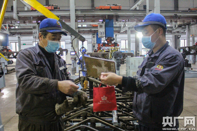 喬司檢修車(chē)間轉(zhuǎn)向架班黨支部書(shū)記韓俊在檢修大庫(kù)為職工王忠發(fā)放口罩(央廣網(wǎng)發(fā) 陳靜 攝)