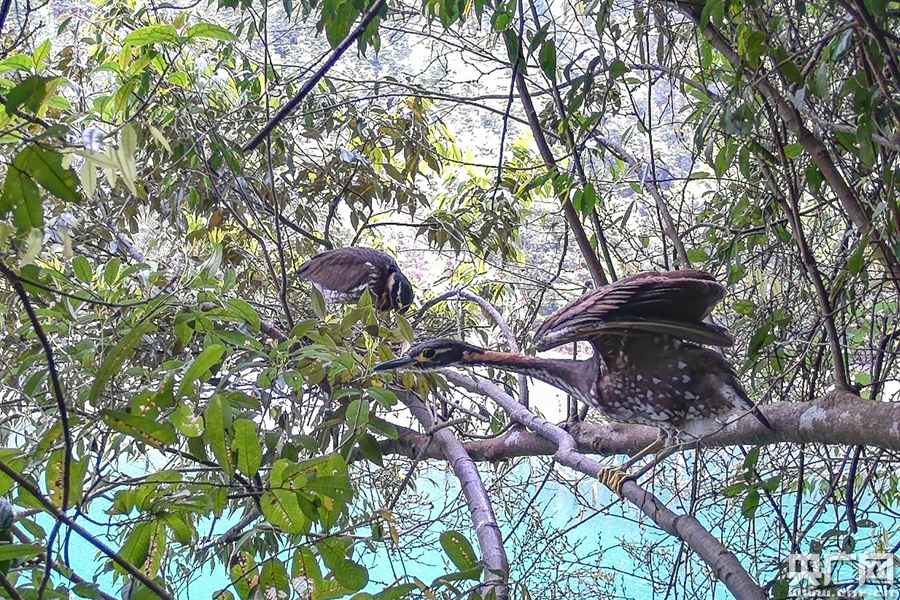 今年以來,南嶺地區(qū)啟動大規(guī)模的野生動植物監(jiān)測工作。視界紀錄監(jiān)測人員自去年底進駐南嶺地區(qū)拍攝全面反映南嶺物種生態(tài)紀錄片——《南嶺物語》,對重點物種采取追蹤系列拍攝。4月1日下午,視界紀錄工作人員巡山,在距水庫2公里處,發(fā)現(xiàn)2只疑似海南虎斑鳽從眼前飛過,便在附近山體仔細搜尋,最終在水庫旁的山崖密林中發(fā)現(xiàn)一個由細樹枝壘成的大型鳥巢。隨后,工作人員在疑似海南虎斑鳽鳥巢的3米外放置2臺紅外監(jiān)控相機進行全方位監(jiān)測。4月9日中午取回紅外監(jiān)控材料,最終確認視頻監(jiān)控中這2只正在筑巢和交配的鳥是海南虎斑鳽。根據(jù)監(jiān)測隊員多日來的觀察,這2只海南虎斑鳽晚上回巢交配,白天則外出而無所蹤影。監(jiān)測隊員曾連續(xù)多天在白天跟蹤它們的蹤跡,但是一無所獲。