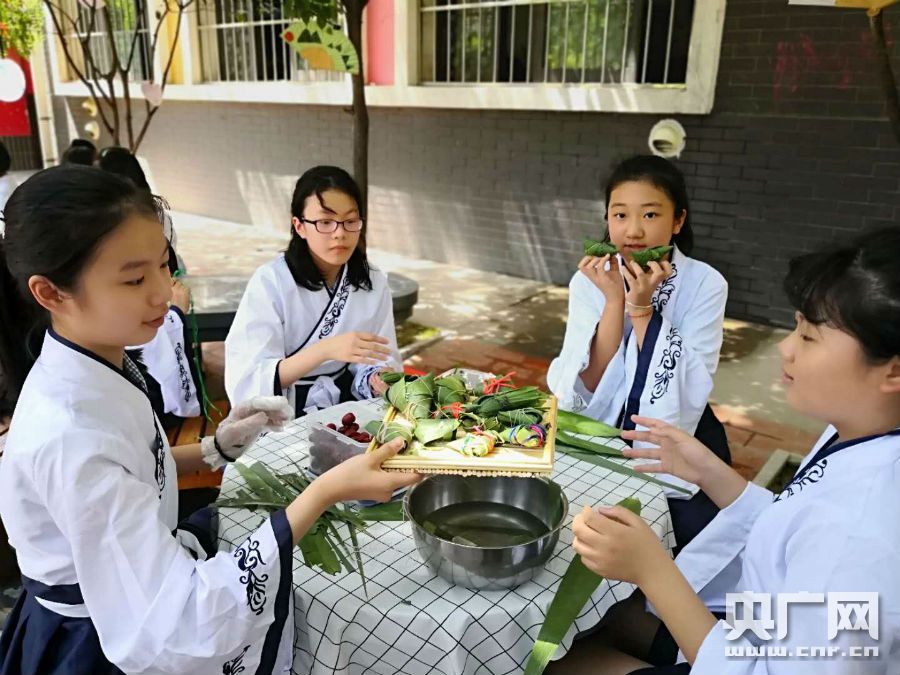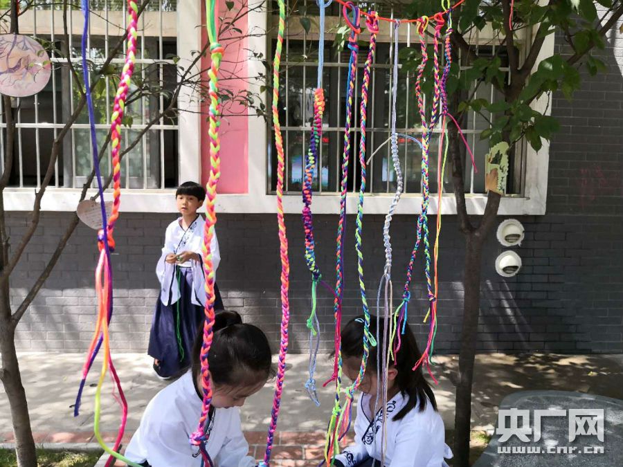 旱地龍舟大賽現(xiàn)場,紅、藍、黃、綠四艘龍舟在學生們的齊心協(xié)力下在操場上來回“游弋”,兩邊的同學紛紛吶喊助威;操場邊的石頭桌椅旁,幾位身穿漢服的女生正在包粽子,在老師指導下,孩子們手指穿梭、粽葉翻飛,綠粽葉、白糯米、大紅棗,形態(tài)各異的粽子在孩子們的手中完成;二年級的小學生正在制作五彩繩,五彩線在孩子們手中編制成各種手環(huán)、彩繩,傳達出孩子們美好的祝福;另外還有手剪龍舟、經典詩詞朗誦等各種活動。