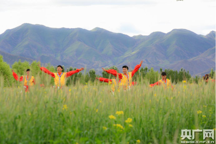 藏族小伙在綠麥草地上跳舞