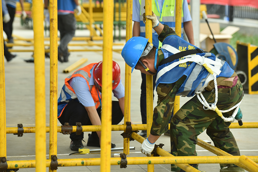 上午9:00,本屆比賽正式開始,鋁合金模板、腳手架搭設(shè)、電焊三個(gè)項(xiàng)目的參賽隊(duì)員迅速投入到緊張的比賽中,他們認(rèn)真拼裝、搭設(shè)、起焊,一場(chǎng)全面展現(xiàn)現(xiàn)代建筑工人風(fēng)采的技能較量正式開始。在前一天下午,參賽人員參加了鋁合金模板、腳手架搭設(shè)、電焊和安全隱患排查等項(xiàng)目的理論考試。