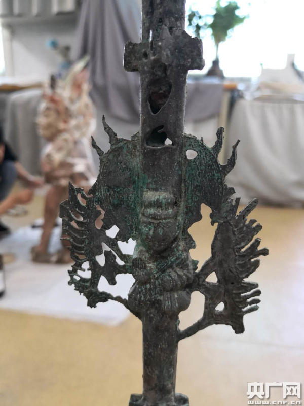 那么,文保人員是根據(jù)什么來證明葉片在樹桿上的位置、掛法?宋俊榮說,主要還是根據(jù)搖錢樹出土?xí)r的情況:“當(dāng)時(shí)樹桿雖然倒在地上,但是樹桿上面原有的或者是底下還有一些分枝,雖然斷了,但在旁邊,我們都把位置標(biāo)好,依據(jù)這去復(fù)制后面的東西。不是說我們想當(dāng)然復(fù)原、隨便掛上去,我們完全是依據(jù)它出土的情況,來做后期的復(fù)原修復(fù)工作!”