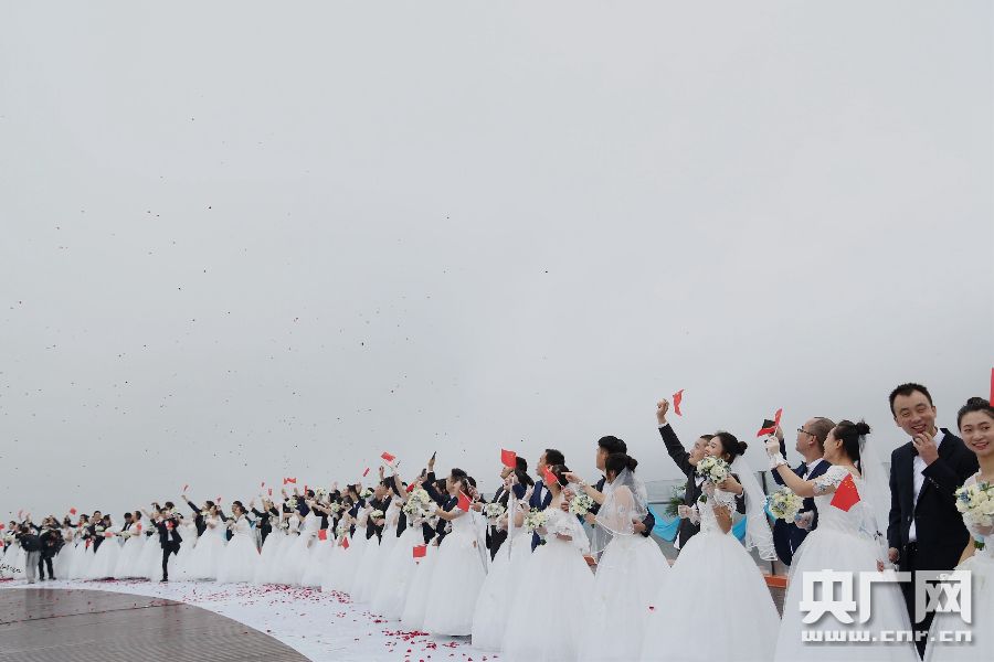 當(dāng)天上午,在婚禮進(jìn)行曲中,199對“新人”雙雙攜手走進(jìn)儀式現(xiàn)場!靶氯恕眰兦f嚴(yán)宣讀結(jié)婚誓詞,并為對方戴上象征永恒愛情的戒指。在輕柔浪漫、婉轉(zhuǎn)悠揚(yáng)的交響樂中,“新人”深情擁吻,現(xiàn)場幸福彌漫。儀式現(xiàn)場,主辦方還精心設(shè)計了玫瑰花雨儀式和投遞《十年后的我們》一封信活動。
