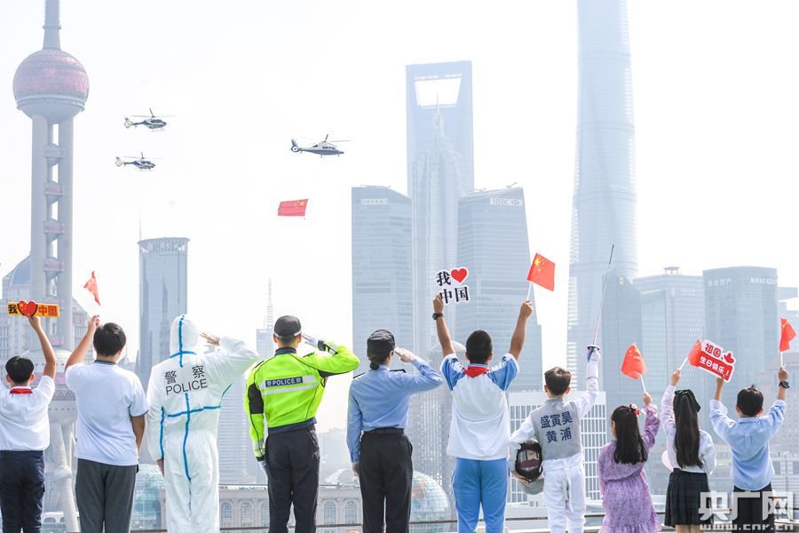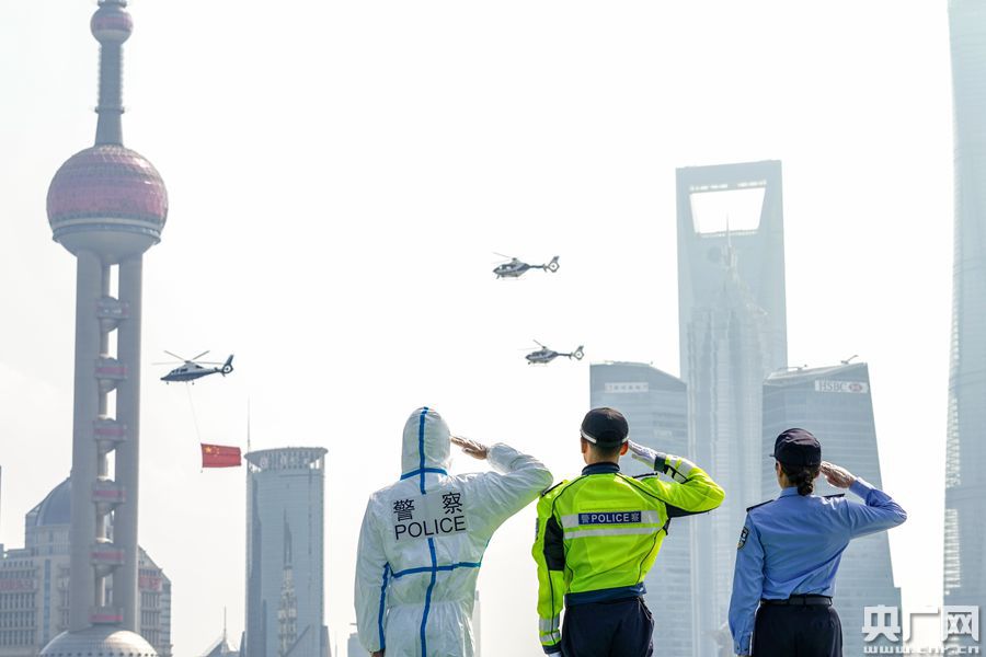 上午10時(shí),當(dāng)外灘鐘樓的鐘聲敲響之際,上海市公安局警務(wù)航空隊(duì)的三架警用直升機(jī)出現(xiàn)在了黃浦江上空,吸引了市民和游客駐足仰望,大家為之歡呼、為之雀躍,共同喜迎新中國(guó)71周年華誕。領(lǐng)航的H155警用直升機(jī)下方懸掛著一面6.45×4.3米的五星紅旗,迎風(fēng)飄揚(yáng)。兩架EC-135警用直升機(jī)在其后方分列左右護(hù)航,整個(gè)機(jī)隊(duì)呈“品”字型掠過黃浦江上空,馬達(dá)轟鳴,蔚為壯觀。