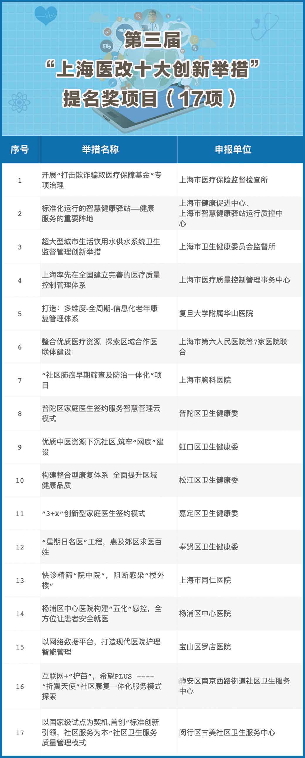 今年的評選活動正值抗疫期間,但社會反響依舊熱烈,共收到辦醫(yī)主體、醫(yī)療衛(wèi)生機(jī)構(gòu)和市級衛(wèi)生計生相關(guān)學(xué)會(協(xié)會)等推薦申報的58條舉措。經(jīng)過專家嚴(yán)格遴選,產(chǎn)生了27條入圍舉措,并通過“健康上海12320”官方微信接受市民投票。日前,第三屆“上海醫(yī)改十大創(chuàng)新舉措”評選結(jié)果正式出爐,現(xiàn)向社會公布。這些獲獎、入圍舉措引起社會強(qiáng)烈反響,全方位展示了上海醫(yī)改的突破性進(jìn)展和積極成效,為上海、長三角乃至全國居民就醫(yī)帶來了實實在在的獲得感、幸福感。