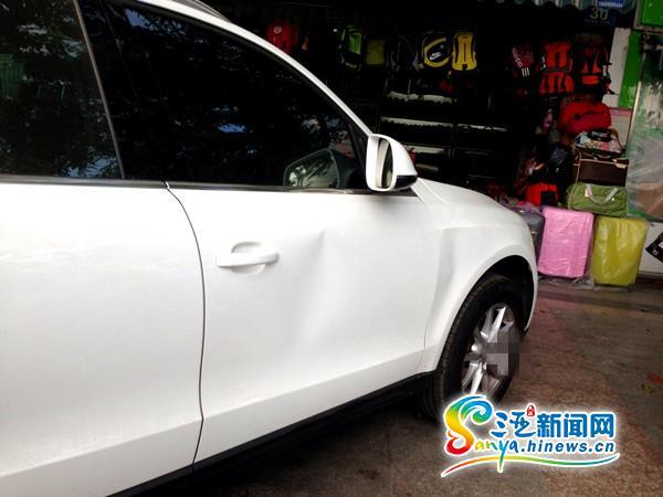 沖突中,停在一邊的轎車被撞凹陷(三亞新聞網(wǎng)記者 劉麗萍攝)