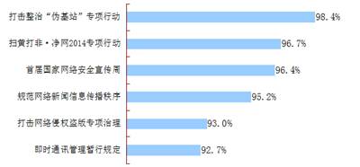 網(wǎng)民對于中央政府發(fā)起的各項網(wǎng)絡(luò)治理行動總體表示關(guān)注,百度以“網(wǎng)絡(luò)治理”為關(guān)鍵詞的相關(guān)搜索結(jié)果有近50萬條,新浪微博相關(guān)貼文近350萬條。在高關(guān)注度下,網(wǎng)民對于互聯(lián)網(wǎng)治理行動表示出高度支持。調(diào)查顯示,網(wǎng)民對6項網(wǎng)絡(luò)治理行動的支持率均超過了90%。有4項治理行動的支持度超過了95%。其中,98.4%的網(wǎng)民表示支持“打擊整治偽基站專項行動”,96.7%的網(wǎng)民表示支持“掃黃打非.凈網(wǎng)2014專項行動”,96.4%的網(wǎng)民表示支持“首屆國家網(wǎng)絡(luò)安全宣傳周”,95.2%的網(wǎng)民表示支持“規(guī)范網(wǎng)絡(luò)新聞信息傳播秩序?qū)m椥袆印薄?/p>