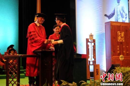 4日,中山大學舉行2015屆畢業(yè)典禮暨2015年學位授予儀式,圖為校長羅俊向畢業(yè)生授予學位。 崔煜坤 攝