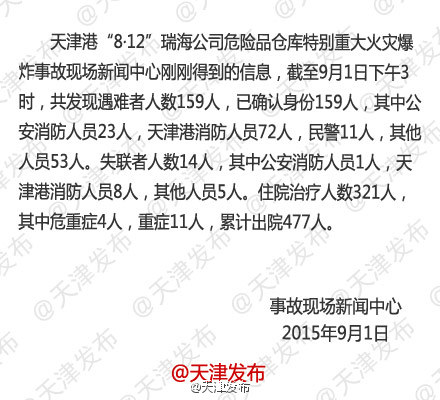 央廣網(wǎng)天津9月1日消息 據(jù)天津發(fā)布微博消息,天津“8·12”瑞海公司危險品倉庫特別重大火災(zāi)爆炸事故現(xiàn)場新聞中心剛剛得到的消息,截至到9月1日下午3時,共發(fā)現(xiàn)遇難者人數(shù)159人,已確認身份159人,其中,公安消防人員23人,天津港消防人員72人,民警11人,其他人員53人。失聯(lián)人數(shù)14人,其中公安消防人員1人,天津港消防人員8人,其他人員5人。住院治療人數(shù)321人,其中危重癥4人,重癥11人,累計出院477人。